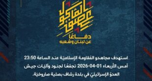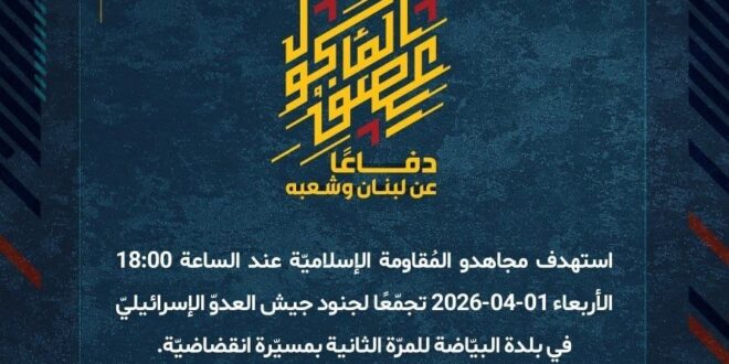 دفاعًا عن لبنان وشعبه، استهدف مجاهدو المُقاومة الإسلاميّة عند الساعة 18:00 الأربعاء 01-04-2026 تجمّعًا لجنود جيش العدوّ الإسرائيليّ في بلدة البيّاضة للمرّة الثانية بمسيّرة انقضاضيّة.