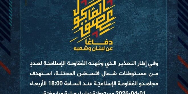 دفاعًا عن لبنان وشعبه، وفي إطار التحذير الذي وجّهته المُقاومة الإسلاميّة لعددٍ من مستوطنات شمال فلسطين المحتلة، استهدف مجاهدو المُقاومة الإسلاميّة عند الساعة 18:00 الأربعاء 01-04-2026 مستوطنة نهاريا بصلية صاروخيّة.