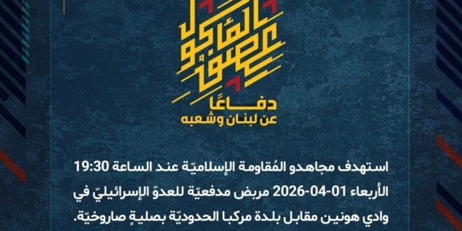دفاعًا عن لبنان وشعبه، استهدف مجاهدو المُقاومة الإسلاميّة عند الساعة 19:30 الأربعاء 01-04-2026 مربض مدفعيّة للعدوّ الإسرائيليّ في وادي هونين مقابل بلدة مركبا الحدوديّة بصليةٍ صاروخيّة.