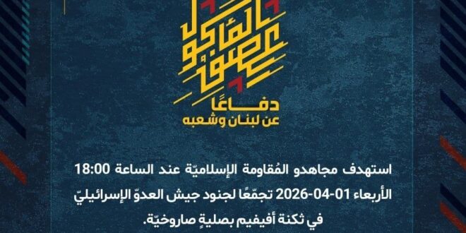 دفاعًا عن لبنان وشعبه، استهدف مجاهدو المُقاومة الإسلاميّة عند الساعة 18:00 الأربعاء 01-04-2026 تجمّعًا لجنود جيش العدوّ الإسرائيليّ في ثكنة أفيفيم بصليةٍ صاروخيّة.