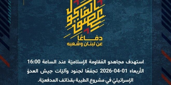دفاعًا عن لبنان وشعبه، استهدف مجاهدو المُقاومة الإسلاميّة عند الساعة 16:00 الأربعاء 01-04-2026 تجمّعًا لجنود وآليّات جيش العدوّ الإسرائيليّ في مشروع الطيبة بقذائف المدفعيّة.