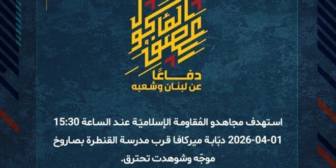 دفاعًا عن لبنان وشعبه، استهدف مجاهدو المُقاومة الإسلاميّة عند الساعة 15:30 الأربعاء 01-04-2026 دبّابة ميركافا قرب مدرسة القنطرة بصاروخ موجّه وشوهدت تحترق.