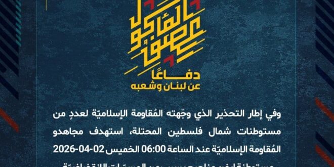 دفاعًا عن لبنان وشعبه، وفي إطار التحذير الذي وجّهته المُقاومة الإسلاميّة لعددٍ من مستوطنات شمال فلسطين المحتلة، استهدف مجاهدو المُقاومة الإسلاميّة عند الساعة 06:00 الخميس 02-04-2026 مستوطنة إيفن مناحيم بسرب من المسيّرات الانقضاضيّة.