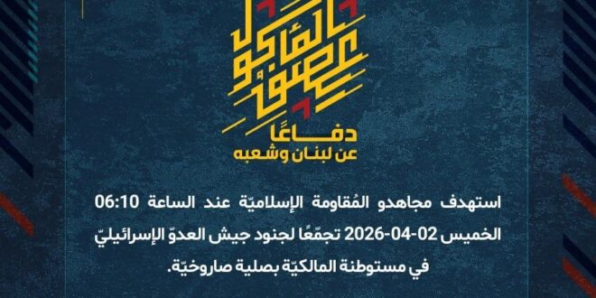 دفاعًا عن لبنان وشعبه، استهدف مجاهدو المُقاومة الإسلاميّة عند الساعة 06:10 الخميس 02-04-2026 تجمّعًا لجنود جيش العدوّ الإسرائيليّ في مستوطنة المالكيّة بصلية صاروخيّة.
