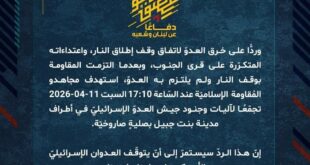 دفاعًا عن لبنان وشعبه، وفي إطار التحذير الذي وجّهته المُقاومة الإسلاميّة لعددٍ من مستوطنات شمال فلسطين المحتلة، استهدف مجاهدو المُقاومة الإسلاميّة عند الساعة 08:30 الخميس 02-04-2026 مستوطنة كريات شمونة بصلية صاروخية.