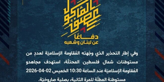 دفاعًا عن لبنان وشعبه، وفي إطار التحذير الذي وجّهته المُقاومة الإسلاميّة لعددٍ من مستوطنات شمال فلسطين المحتلّة، استهدف مجاهدو المُقاومة الإسلاميّة عند الساعة 10:30 الخميس 02-04-2026 مستوطنة المطلّة للمرة الثانية، بصلية صاروخيّة.