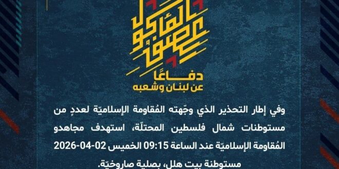 دفاعًا عن لبنان وشعبه، وفي إطار التحذير الذي وجّهته المُقاومة الإسلاميّة لعددٍ من مستوطنات شمال فلسطين المحتلّة، استهدف مجاهدو المُقاومة الإسلاميّة عند الساعة 09:15 الخميس 02-04-2026 مستوطنة بيت هلل، بصلية صاروخيّة.