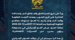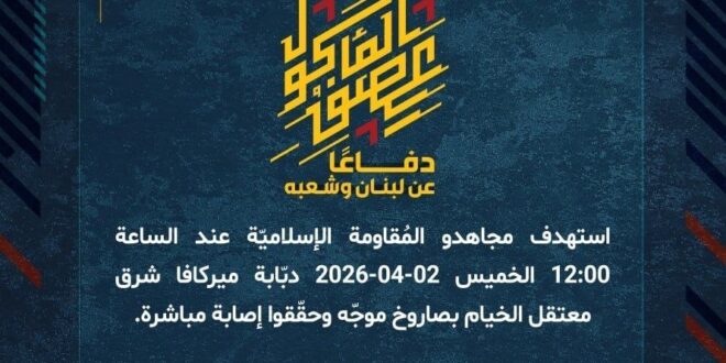 دفاعًا عن لبنان وشعبه، استهدف مجاهدو المُقاومة الإسلاميّة عند الساعة 12:00 الخميس 02-04-2026 دبّابة ميركافا شرق معتقل الخيام بصاروخ موجّه وحقّقوا إصابة مباشرة.