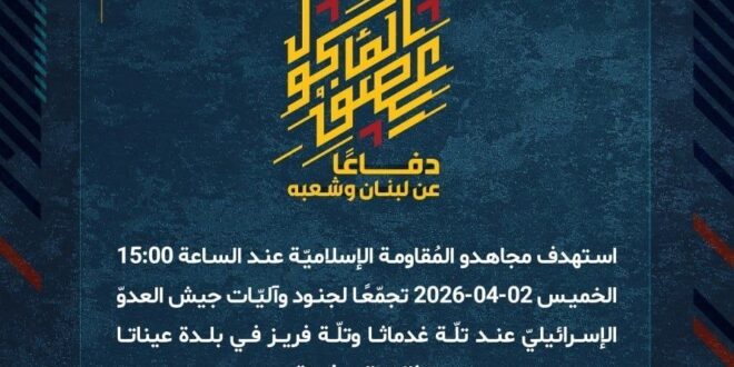 دفاعًا عن لبنان وشعبه، استهدف مجاهدو المُقاومة الإسلاميّة عند الساعة 15:00 الخميس 02-04-2026 تجمّعًا لجنود وآليّات جيش العدوّ الإسرائيليّ عند تلّة غدماثا وتلّة فريز في بلدة عيناتا بقذائف المدفعيّة.