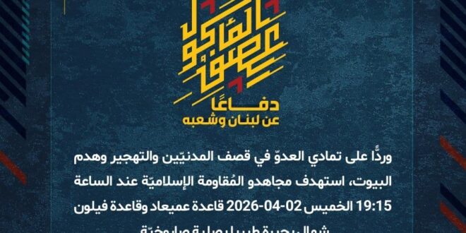 دفاعًا عن لبنان وشعبه، وردًّا على تمادي العدوّ في قصف المدنيّين والتهجير وهدم البيوت، استهدف مجاهدو المُقاومة الإسلاميّة عند الساعة 19:15 الخميس 02-04-2026 قاعدة عميعاد وقاعدة فيلون شمال بحيرة طبريا بصلية صاروخيّة.