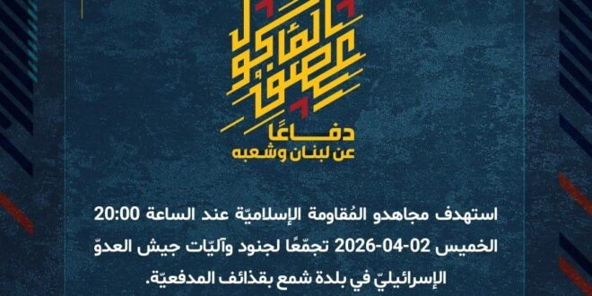دفاعًا عن لبنان وشعبه، استهدف مجاهدو المُقاومة الإسلاميّة عند الساعة 20:00 الخميس 02-04-2026 تجمّعًا لجنود وآليّات جيش العدوّ الإسرائيليّ في بلدة شمع بقذائف المدفعيّة.