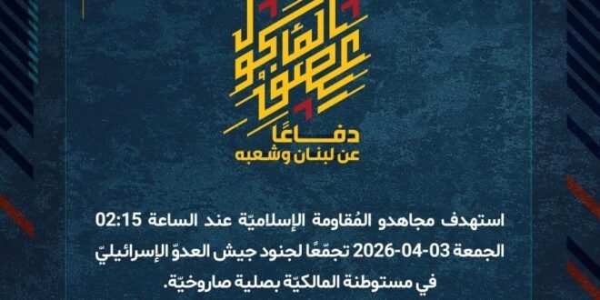 دفاعًا عن لبنان وشعبه، استهدف مجاهدو المُقاومة الإسلاميّة عند الساعة 02:15 الجمعة 03-04-2026 تجمّعًا لجنود جيش العدوّ الإسرائيليّ في مستوطنة المالكيّة بصلية صاروخيّة.