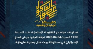 دفاعًا عن لبنان وشعبه، استهدف مجاهدو المُقاومة الإسلاميّة عند الساعة 05:30 الجمعة 03-04-2026 عقدة اتّصالات في مستوطنة معيليا بسرب من المسيّرات الانقضاضيّة.