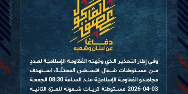 دفاعًا عن لبنان وشعبه، وفي إطار التحذير الذي وجّهته المُقاومة الإسلاميّة لعددٍ من مستوطنات شمال فلسطين المحتلّة، استهدف مجاهدو المُقاومة الإسلاميّة عند الساعة 08:30 الجمعة 03-04-2026 مستوطنة كريات شمونة للمرّة الثانية بصلية صاروخيّة.