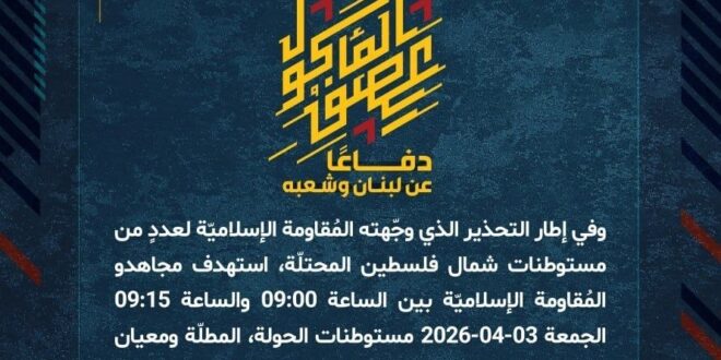دفاعًا عن لبنان وشعبه، وفي إطار التحذير الذي وجّهته المُقاومة الإسلاميّة لعددٍ من مستوطنات شمال فلسطين المحتلّة، استهدف مجاهدو المُقاومة الإسلاميّة بين الساعة 09:00 والساعة 09:15 الجمعة 03-04-2026 مستوطنات الحولة، المطلّة ومعيان باروخ بصليات صاروخيّة.