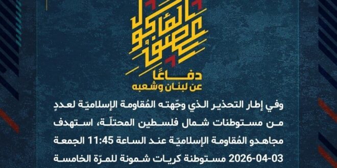 دفاعًا عن لبنان وشعبه، وفي إطار التحذير الذي وجّهته المُقاومة الإسلاميّة لعددٍ من مستوطنات شمال فلسطين المحتلّة، استهدف مجاهدو المُقاومة الإسلاميّة عند الساعة 11:45 الجمعة 03-04-2026 مستوطنة كريات شمونة للمرّة الخامسة بصلية صاروخيّة.