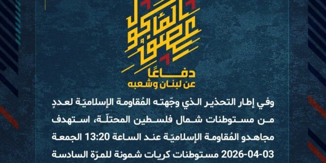 دفاعًا عن لبنان وشعبه، وفي إطار التحذير الذي وجّهته المُقاومة الإسلاميّة لعددٍ من مستوطنات شمال فلسطين المحتلّة، استهدف مجاهدو المُقاومة الإسلاميّة عند الساعة 13:20 الجمعة 03-04-2026 مستوطنات كريات شمونة للمرّة السادسة والمطلة للمرّة الثالثة وكفريوفال بصلياتٍ صاروخيّة.
