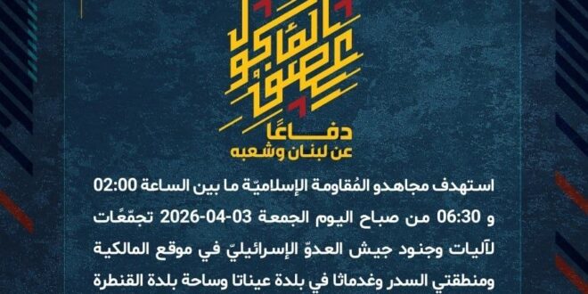 دفاعًا عن لبنان وشعبه، استهدف مجاهدو المُقاومة الإسلاميّة ما بين الساعة 02:00 و 06:30 من صباح اليوم الجمعة 03-04-2026 تجمّعًات لآليات وجنود جيش العدوّ الإسرائيليّ في موقع المالكية ومنطقتي السدر وغدماثا في بلدة عيناتا وساحة بلدة القنطرة بصليات صاروخيّة وقذائف المدفعيّة على دفعات.