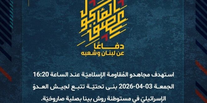 دفاعًا عن لبنان وشعبه، استهدف مجاهدو المُقاومة الإسلاميّة عند الساعة 16:20 الجمعة 03-04-2026 بنى تحتيّة تتبع لجيش العدوّ الإسرائيليّ في مستوطنة روش بينا بصلية صاروخيّة.