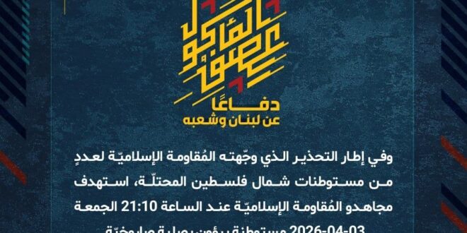 دفاعًا عن لبنان وشعبه، وفي إطار التحذير الذي وجّهته المُقاومة الإسلاميّة لعددٍ من مستوطنات شمال فلسطين المحتلّة، استهدف مجاهدو المُقاومة الإسلاميّة عند الساعة 21:10 الجمعة 03-04-2026 مستوطنة يرؤون بصلية صاروخيّة.