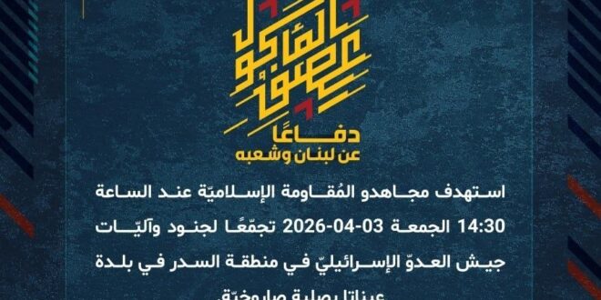 دفاعًا عن لبنان وشعبه، استهدف مجاهدو المُقاومة الإسلاميّة عند الساعة 14:30 الجمعة 03-04-2026 تجمّعًا لجنود وآليّات جيش العدوّ الإسرائيليّ في منطقة السدر في بلدة عيناتا بصلية صاروخيّة.