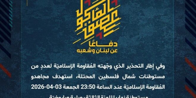 دفاعًا عن لبنان وشعبه، وفي إطار التحذير الذي وجّهته المُقاومة الإسلاميّة لعددٍ من مستوطنات شمال فلسطين المحتلة، استهدف مجاهدو المُقاومة الإسلاميّة عند الساعة 23:50 الجمعة 03-04-2026 مستوطنة نهاريا للمرّة الثالثة بصلية صاروخيّة.