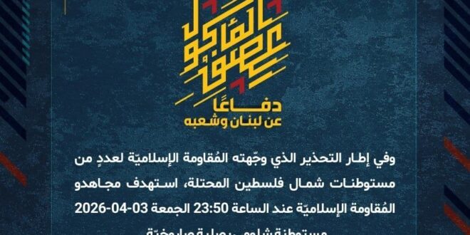 دفاعًا عن لبنان وشعبه، وفي إطار التحذير الذي وجّهته المُقاومة الإسلاميّة لعددٍ من مستوطنات شمال فلسطين المحتلة، استهدف مجاهدو المُقاومة الإسلاميّة عند الساعة 23:50 الجمعة 03-04-2026 مستوطنة شلومي بصلية صاروخيّة.