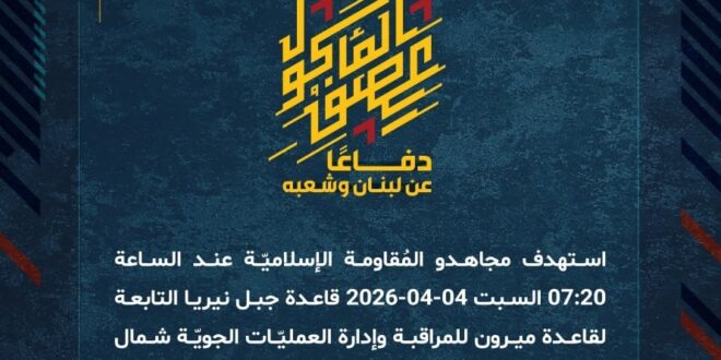 دفاعًا عن لبنان وشعبه، استهدف مجاهدو المُقاومة الإسلاميّة عند الساعة 07:20 السبت 04-04-2026 قاعدة جبل نيريا التابعة لقاعدة ميرون للمراقبة وإدارة العمليّات الجويّة شمال فلسطين المحتلّة بصلية صاروخية.