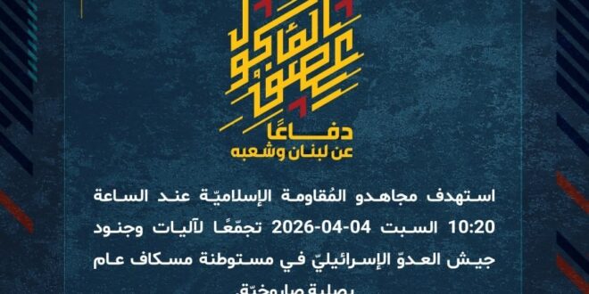 دفاعًا عن لبنان وشعبه، استهدف مجاهدو المُقاومة الإسلاميّة عند الساعة 10:20 السبت 04-04-2026 تجمّعًا لآليات وجنود جيش العدوّ الإسرائيليّ في مستوطنة مسكاف عام بصلية صاروخيّة.