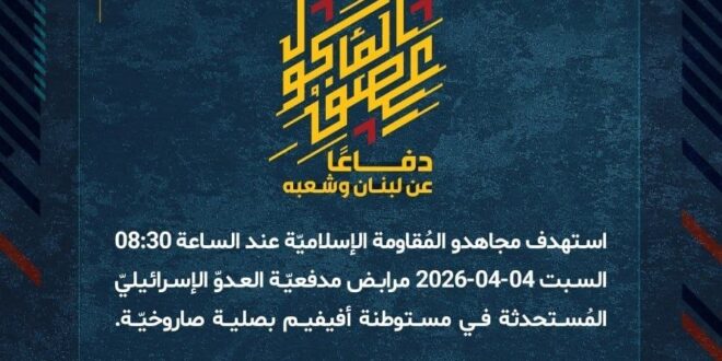 دفاعًا عن لبنان وشعبه، استهدف مجاهدو المُقاومة الإسلاميّة عند الساعة 08:30 السبت 04-04-2026 مرابض مدفعيّة العدوّ الإسرائيليّ المُستحدثة في مستوطنة أفيفيم بصلية صاروخيّة.