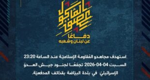 دفاعًا عن لبنان وشعبه، استهدف مجاهدو المُقاومة الإسلاميّة عند الساعة 08:20 السبت 04-04-2026 تجمّعًا لجنود جيش العدوّ الإسرائيليّ في محيط موقع السمّاقة في تلال كفرشوبا المُحتلّة بسربٍ من المسيّرات الانقضاضيّة.