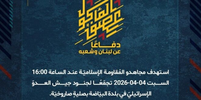 دفاعًا عن لبنان وشعبه، استهدف مجاهدو المُقاومة الإسلاميّة عند الساعة 16:00 السبت 04-04-2026 تجمّعًا لجنود جيش العدوّ الإسرائيليّ في بلدة البيّاضة بصليةٍ صاروخيّة.