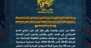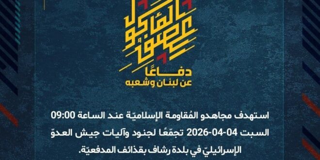 دفاعًا عن لبنان وشعبه، استهدف مجاهدو المُقاومة الإسلاميّة عند الساعة 09:00 السبت 04-04-2026 تجمّعًا لجنود وآليات جيش العدوّ الإسرائيليّ في بلدة رشاف بقذائف المدفعيّة.