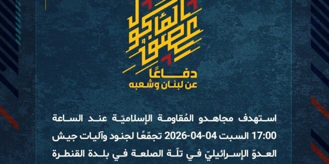 دفاعًا عن لبنان وشعبه، استهدف مجاهدو المُقاومة الإسلاميّة عند الساعة 17:00 السبت 04-04-2026 تجمّعًا لجنود وآليات جيش العدوّ الإسرائيليّ في تلّة الصلعة في بلدة القنطرة بقذائف المدفعيّة.