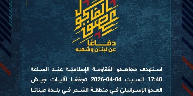 دفاعًا عن لبنان وشعبه، استهدف مجاهدو المُقاومة الإسلاميّة عند الساعة 17:40 السبت 04-04-2026 تجمّعًا لآليات جيش العدوّ الإسرائيليّ في منطقة السّدر في بلدة عيناتا بقذائف المدفعيّة.