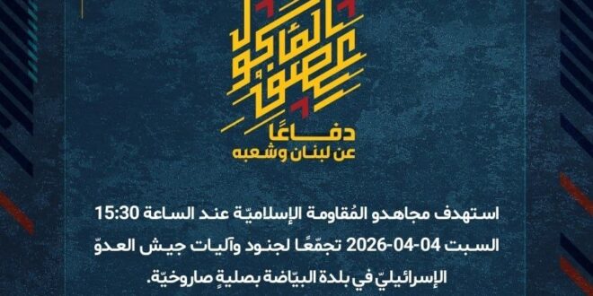 دفاعًا عن لبنان وشعبه، استهدف مجاهدو المُقاومة الإسلاميّة عند الساعة 15:30 السبت 04-04-2026 تجمّعًا لجنود وآليات جيش العدوّ الإسرائيليّ في بلدة البيّاضة بصليةٍ صاروخيّة.