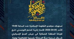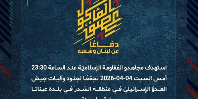 دفاعًا عن لبنان وشعبه، استهدف مجاهدو المُقاومة الإسلاميّة عند الساعة 23:30 أمس السبت 04-04-2026 تجمّعًا لجنود وآليات جيش العدوّ الإسرائيليّ في منطقة السّدر في بلدة عيناتا بصليةٍ صاروخيّة.