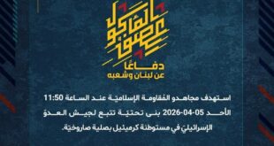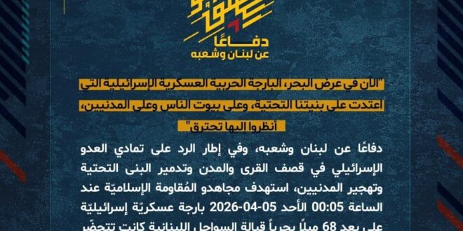 دفاعًا عن لبنان وشعبه، وفي إطار الرد على تمادي العدو الإسرائيلي في قصف القرى والمدن وتدمير البنى التحتية وتهجير المدنيين، استهدف مجاهدو المُقاومة الإسلاميّة عند الساعة 00:05 الأحد 05-04-2026 بارجة عسكريّة إسرائيليّة على بعد 68 ميلاً بحرياً قبالة السواحل اللبنانية كانت تتحضّر لتنفيذ اعتداءاتها على الأراضي اللبنانيّة؛ وتمت عملية الإستهداف بصاروخ كروز بحريّ بعد رصد الهدف لساعات، وتأكّدت إصابته بشكل مباشر.