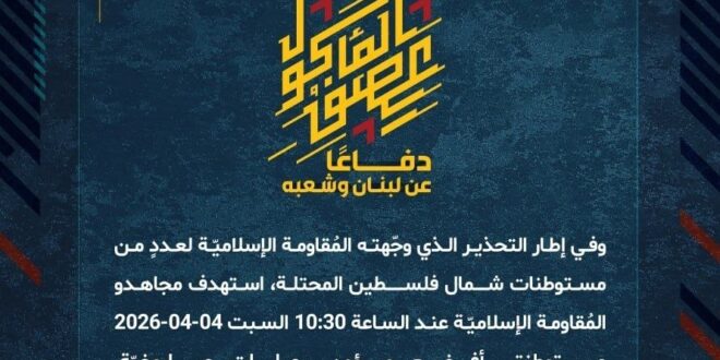 دفاعًا عن لبنان وشعبه، وفي إطار التحذير الذي وجّهته المُقاومة الإسلاميّة لعددٍ من مستوطنات شمال فلسطين المحتلة، استهدف مجاهدو المُقاومة الإسلاميّة عند الساعة 10:30 السبت 04-04-2026 مستوطنتي أفيفيم ويرؤون بصلياتٍ صاروخيّة.