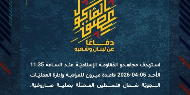 دفاعًا عن لبنان وشعبه، استهدف مجاهدو المُقاومة الإسلاميّة عند الساعة 11:35 الأحد 05-04-2026 قاعدة ميرون للمراقبة وإدارة العمليّات الجويّة شمال فلسطين المحتلّة بصلية صاروخيّة.