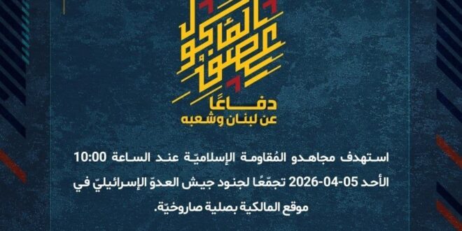 دفاعًا عن لبنان وشعبه، استهدف مجاهدو المُقاومة الإسلاميّة عند الساعة 10:00 الأحد 05-04-2026 تجمّعًا لجنود جيش العدوّ الإسرائيليّ في موقع المالكية بصلية صاروخيّة.