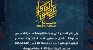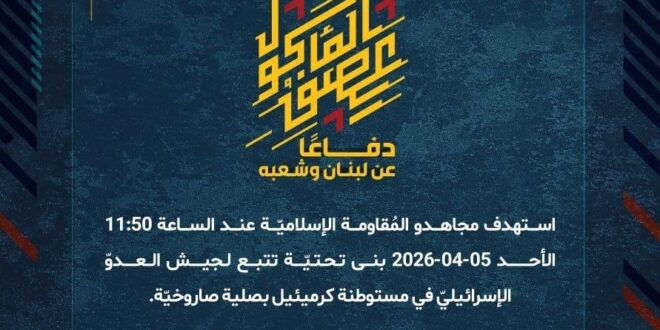 دفاعًا عن لبنان وشعبه، استهدف مجاهدو المُقاومة الإسلاميّة عند الساعة 11:50 الأحد 05-04-2026 بنى تحتيّة تتبع لجيش العدوّ الإسرائيليّ في مستوطنة كرميئيل بصلية صاروخيّة.