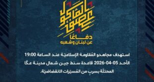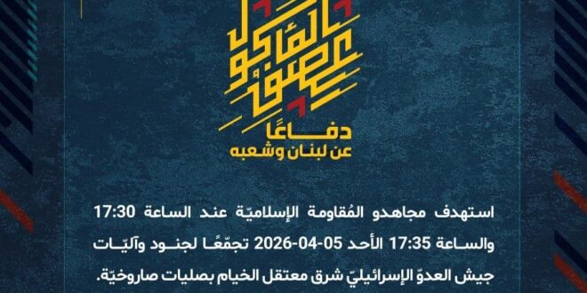 دفاعًا عن لبنان وشعبه، استهدف مجاهدو المُقاومة الإسلاميّة عند الساعة 17:30 والساعة 17:35 الأحد 05-04-2026 تجمّعًا لجنود وآليّات جيش العدوّ الإسرائيليّ شرق معتقل الخيام بصليات صاروخيّة.