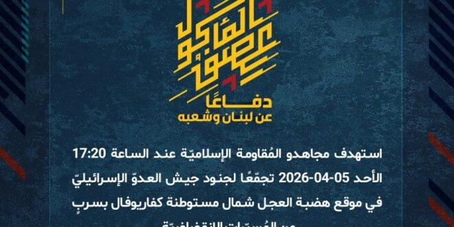 دفاعًا عن لبنان وشعبه، استهدف مجاهدو المُقاومة الإسلاميّة عند الساعة 17:20 الأحد 05-04-2026 تجمّعًا لجنود جيش العدوّ الإسرائيليّ في موقع هضبة العجل شمال مستوطنة كفاريوفال بسربٍ من المُسيّرات الانقضاضيّة.