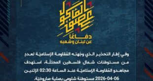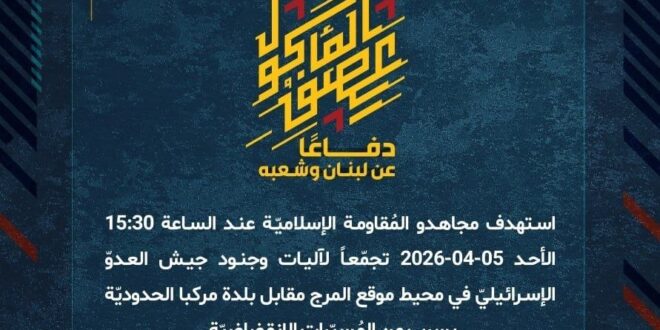 دفاعًا عن لبنان وشعبه، استهدف مجاهدو المُقاومة الإسلاميّة عند الساعة 15:30 الأحد 05-04-2026 تجمّعاً لآليات وجنود جيش العدوّ الإسرائيليّ في محيط موقع المرج مقابل بلدة مركبا الحدوديّة بسربٍ من المُسيّرات الانقضاضيّة.