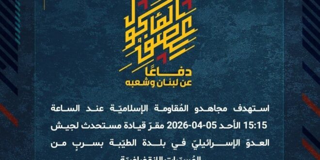 دفاعًا عن لبنان وشعبه، استهدف مجاهدو المُقاومة الإسلاميّة عند الساعة 15:15 الأحد 05-04-2026 مقرّ قيادة مستحدث لجيش العدوّ الإسرائيليّ في بلدة الطيّبة بسربٍ من المُسيّرات الانقضاضيّة.