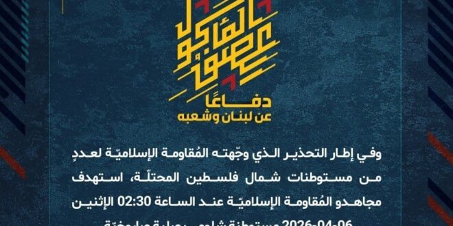 دفاعًا عن لبنان وشعبه، وفي إطار التحذير الذي وجّهته المُقاومة الإسلاميّة لعددٍ من مستوطنات شمال فلسطين المحتلّة، استهدف مجاهدو المُقاومة الإسلاميّة عند الساعة 02:30 الإثنين 06-04-2026 مستوطنة شلومي بصلية صاروخيّة.