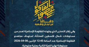 دفاعًا عن لبنان وشعبه، استهدف مجاهدو المُقاومة الإسلاميّة عند الساعة 11:20 الإثنين 06-04-2026 تجمّعًا لآليات وجنود جيش العدوّ الإسرائيليّ في موقع إبل القمح بصليةٍ صاروخيّة.