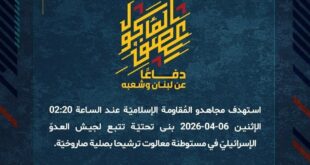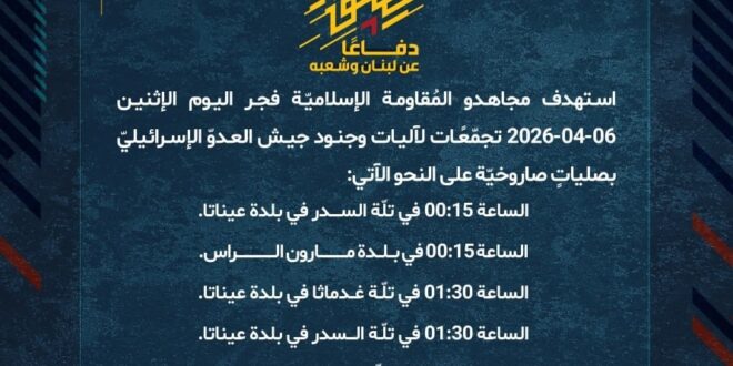 دفاعًا عن لبنان وشعبه، استهدف مجاهدو المُقاومة الإسلاميّة فجر اليوم الإثنين 06-04-2026 تجمّعًات لآليات وجنود جيش العدوّ الإسرائيليّ بصلياتٍ صاروخيّة على النحو الآتي: