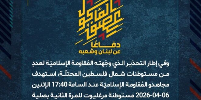 دفاعًا عن لبنان وشعبه، وفي إطار التحذير الذي وجّهته المُقاومة الإسلاميّة لعددٍ من مستوطنات شمال فلسطين المحتلّة، استهدف مجاهدو المُقاومة الإسلاميّة عند الساعة 17:40 الإثنين 06-04-2026 مستوطنة مرغليوت للمرة الثانية بصلية صاروخيّة.